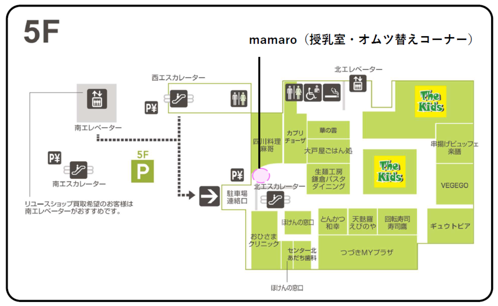 オムツ交換スペースはB2F~6Fの館内トイレにあるほか、3Fのすぽひろば横に、オムツ替えコーナー、授乳室、調乳器コーナー、5F北エスカレーター前に、授乳室・オムツ替えコーナー(mamaro)をご用意しています。