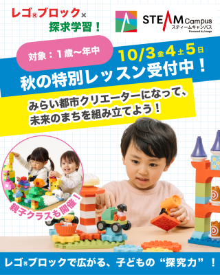 「あつまれ!未来のリーダーたち!」 レゴブロックを教材に、子どもたちの創造力・問題解決力・プログラミング力を楽しく育みます。 スティームキャンパスのプログラムについて、詳しくはホームページをご覧ください。