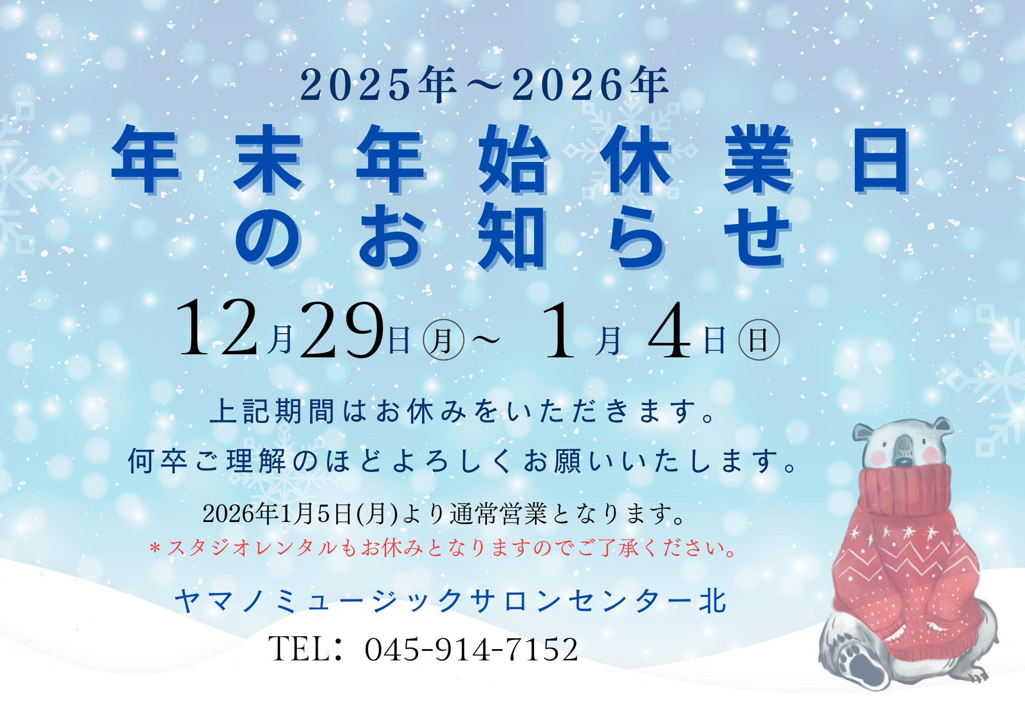 NEW 更新日:2025.12.26 ヤマノミュージックサロン 045-914-7152 年末年始休業のお知らせ 実施日時 2025年12月29日(月)~2026年1月4日(日) X この店舗のショップニュース SIREヘッドレスギター&ベース展示販売中! 期間限定講座「楽器ちょっとだけ体験講座」 【ディズニーの大人気キャラクター”スティッチ”ウクレレ、山野楽器で限定発売!】 「カリンバ」展示販売中! ゴスペルコース体験会開催! スタジオレンタルのご案内です♪ 【4F 山野楽器】懐かしい!!豆本こどものバイエル(全5種)コンプリートお取り扱い中♪