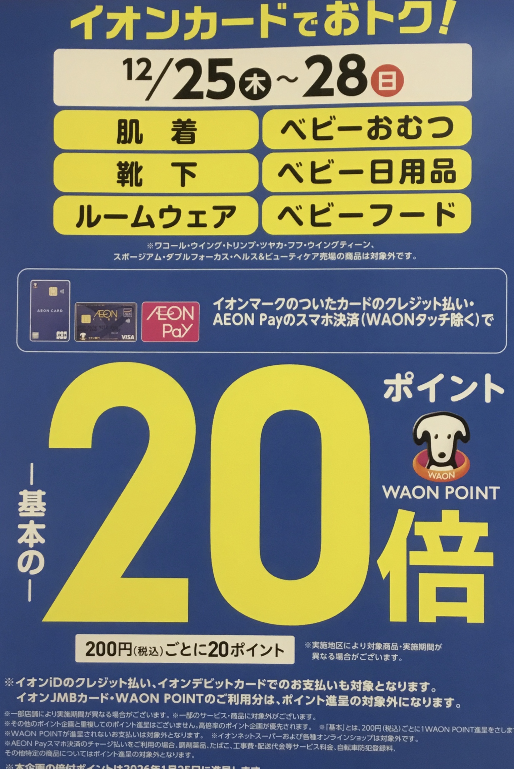 NEW 更新日:2025.12.27 キッズリパブリック 045-914-3430 イオンカードでお得☆ポイント20倍 実施日時 2025/12/25〜12/28 3階にあるイオンのお店 キッズリパブリックからのお知らせです☆ 期間中にお子様の肌着、靴下、ルームウェア、ベビーおむつ、ベビー日用品、ベビーフード をイオンカードのお支払いでご購入いただくと、ポイントが通常の20倍! お得な機会をどうぞお見逃しなく☆ ご来店お待ちしております。 X この店舗のショップニュース 【フードドライブ】食品の寄付にご協力ください♪