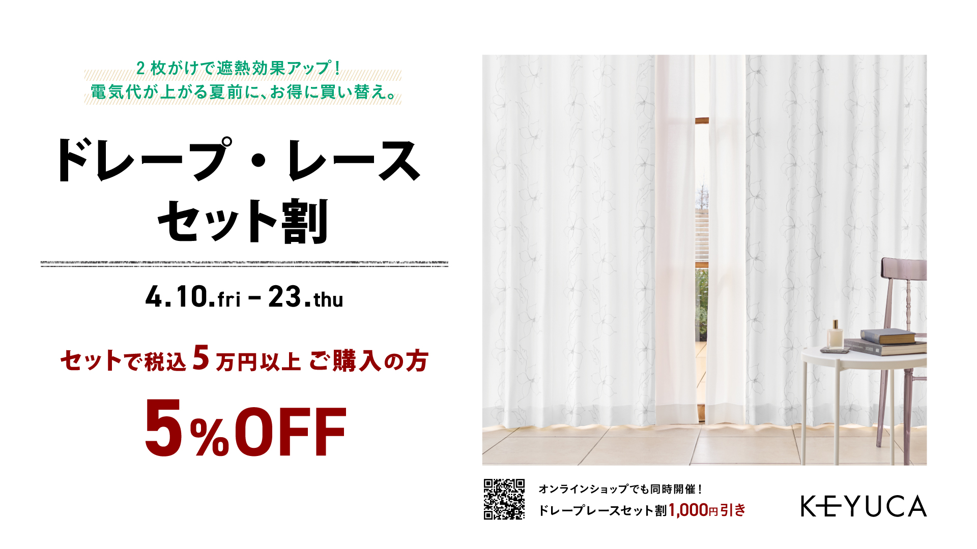 オーダーカーテン ドレープとレースを1点以上ご購入、合計金額が5万円(税込)以上で5%OFF!