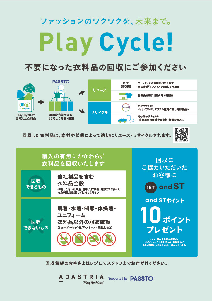 Play Cycle!とは、お客さまのご不要な衣料品を回収し、新しい資源にリサイクル・リユースするアダストリアの環境活動です。