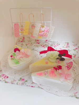 セットになっているのは、花のかたちのウッドピース、絵の具、筆、リボン、ラッピングペーパー。