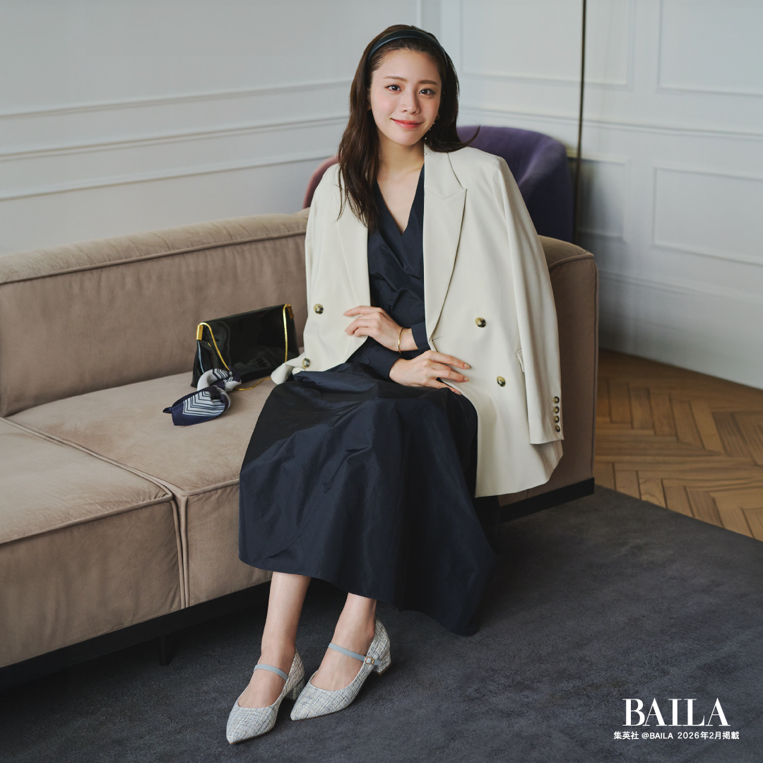 ウエストのベルトを締めてきちんとしたスタイルも、
