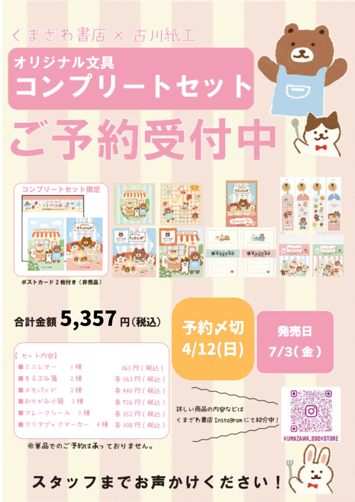 NEW 更新日:2026.04.07 ACADEMIA 045-914-3320 ご予約受付中!くまざわ書店オリジナル文具セット ✩˖°⌖.꙳✩˖°⌖.꙳✩˖°⌖.꙳✩˖°⌖.꙳✩ #くまざわ書店#古川紙工 オリジナル文具 コンプリートセット ご予約受付中です ✩˖°⌖.꙳✩˖°⌖.꙳✩˖°⌖.꙳✩˖°⌖.꙳✩ ご予約締切は4/12まで! コンプリートセットはご予約の方のみになります X この店舗のショップニュース 横浜DeNAベイスターズ2026オフィシャルイヤーマガジン 超かぐや姫公式ガイドブック発売中! 4/5まで!文具全品20%セール&Kポイント3倍! 大人気!「理科ダマン」最新刊発売されました! 4/10発売!名探偵コナン ハイウェイの堕天使ノベライズ予約受付中! 4/15発売!ちろぴの冒険ダイアリー&読書ノート予約受付中! アカデミアにピイちゃんがやってくる!写真撮影会! 映画公開中!「私がビーバーになる時」コーナーございます! 「カドカワ春の還元祭2026」開催中! 4/4(土)サンリオドリル無料体験会!開催します!